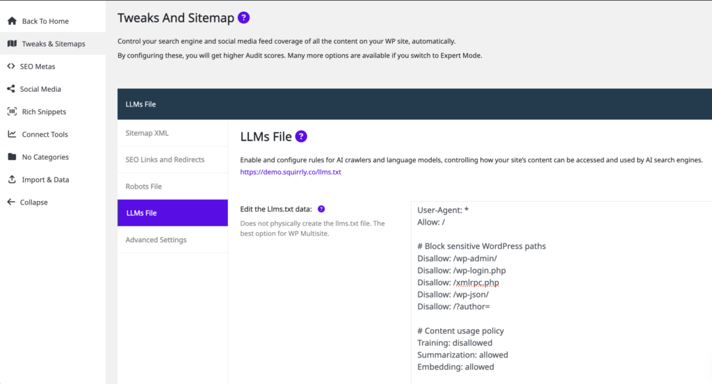 - To reach this section, go to: Squirrly SEO > Technical SEO > Tweaks & Sitemap > LLMs File > Edit the LLMs.txt data