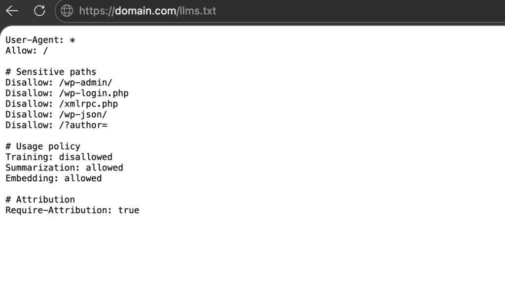 User-agent: *→ Allows LLM systems to access all public content.Allow: /→ Crawlers are allowed to access the whole site.Disallow: /wp-admin/→ Block crawlers from the WordPress admin area.Disallow: /wp-login.php→ Block crawlers from the login page.Disallow: /wp-json/→ Block crawlers from REST API.Disallow: /xmlrpc.php→ Block the XML-RPC API (often exploited by bots).Training: disallowed→ AI tools may read the page but must not use it to train their models.Summarization: allowed→ AI systems may generate summaries or short explanations from your content.Embedding: allowed→ Your content can be indexed in AI search systems and retrieval databases.Require-Attribution: true→ If an AI system references your content, it should include a link or mention the source.